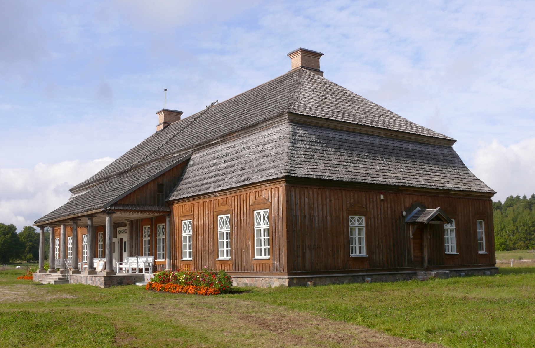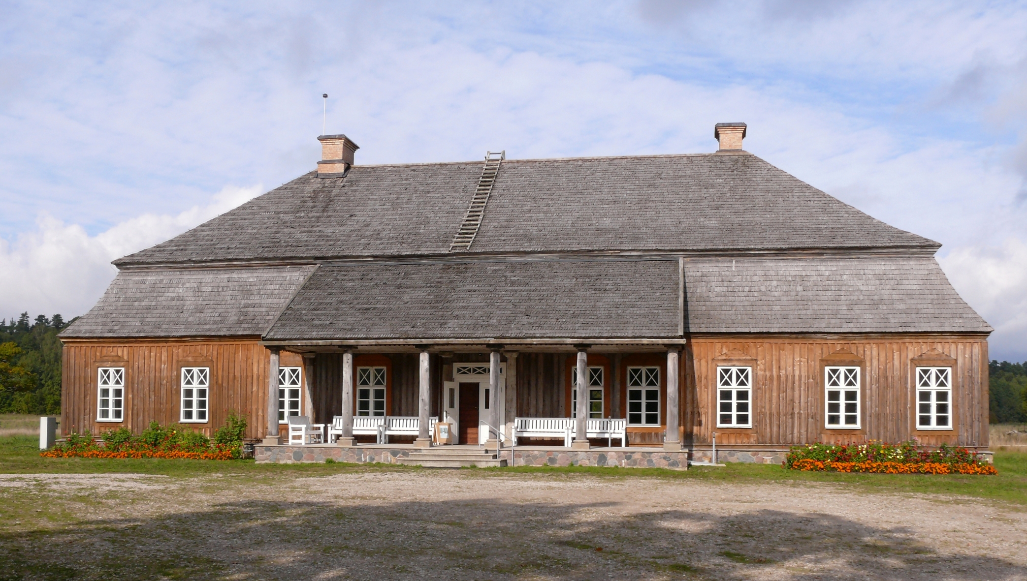 ![]() ![]() Dvaro rūmų istorijaPirmą kartą Aristavėlės dvaras paminėtas Vartbergės kronikoje 1371 m. kaip bajoro Algemino dvaras3. XVI–XVII a. dvarą valdė Šiukštų giminė, vėliau Zabielos3. Dvaro rūmai statyti apie 1700 metus, o jų statytoju laikomas tuometinis dvaro valdytojas Mykolas Zabiela (miręs 1734 m.)2, 3. Kitais duomenimis dvaro rūmai statyti apie 1785 m4. XVIII a. pabaigoje dvarą paveldėjo Medekšų giminė, kuri sodybą pertvarkė, bet išsaugojo barokinį dvaro stilių3. Rūmai rekonstruoti XIX a. pabaigoje2. Medekšos valdė dvarą iki II-ojo pasaulinio karo3. Paskutinis dvaro savininkas Stefanas Medekša (1882–1962) pasitraukė į Vakarus, mirė Londone3. Z. Glogeris savo knygoje „Medinės statyba senojoje Lenkijoje” išleistoje Varšuvoje 1907 m. išsamiai aprašo Aristavėlės dvaro sodybą, kuri tuo metu priklausė Steponui Medekšai (Stefan Medeksza)5. Nurodoma, kad ties įėjimu į rūmus stogelį laiko kolonų portikas5. Dvaro rūmai yra panašūs į neįprastą Siedlnickių šeimos dvarą Vituline (Witulin), Palenkėje5. Aristavėlės dvarą projektavo patyręs architektas5. XIX a. pirmoje pusėje panašūs dvarų rūmai buvo gana paplitę šalyje, tačiau dėl medinės statybos trumpaamžiškumo dauguma jų sunyko (supuvo) ir neišliko iki XX a5. Aristavėlės dvaro rūmuose buvo 12 kambarių5. Didžiojo valgomojo sienos ir lubos išpuoštos įdomiomis freskomis iš Stanislovo (Stanisław) laikotarpio5. Kairėje rūmų pusėje buvo tvartas ir arklidės su vežimine, o dešinėje pusėje – vaismedžių sodas5. Pastatų kompleksą juosė statinių tvora į kurį buvo patenkama per du plačius vartus su mediniais stogeliais5. Aristavėlės dvaro rūmai – tipiškos vidutinių bajorų rezidencijos pavyzdys2, 3. Vienaukštis rūmų pastatas dengtas didžiuliu laiptuotu stogu, daugiau nei dukart aukštesniu už sienas3. XIX a. pabaigoje perplanuota pietrytinė rūmų dalis, pristatytas 6 kolonų portikas2. 1940 m. Aristavėlės dvaras buvo konfiskuotas3. Pokario metais dvare įsikūrė kolūkis: pakeistas kambarių planavimas (įrengtos pertvaros), butai, perstatytos krosnys2, 3. 1980 m. „Sniečkaus” kolūkis dvaro rūmus atidavė Lietuvos liaudies buities muziejui2, 3. 1987 m. rūmai išardyti ir pervežti į muziejų2, 3. 2010 m. rūmai atstatyti muziejaus teritorijoje Rumšiškėse2, 3. 2014–2016 metais Aristavėlės dvaro rūmai restauruoti3. Aristavėlės dvaro rūmai – vienintelis toks išlikęs, vertingas baroko laikotarpio lietuvių medinės architektūros pavyzdys3. Iš seniausio baroko laikotarpio išlikęs puošnus ekspresyvus laužytos konfigūracijos stogas su profiliuotais karniziniais apvadais2, 3. Datavimas