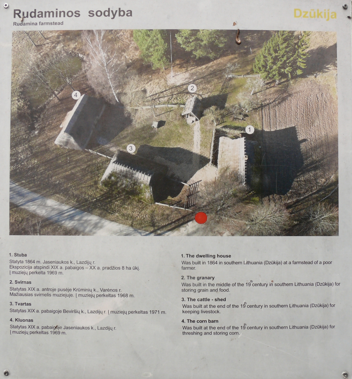 Muziejuje kaimo trobesiai priklauso Rudaminos sodybai, Dzūkijos ekspozicijai. Dendrochronologiniai pastatų tyrimai atlikti 1969 m. Įrašas medienos pavyzdžių inventorizacinėje knygoje byloja: „Lietuva, Lazdijų r., Jaseniauka, Onos Karaliūnienės gyv. namas, 1969 m”. Medienos mėginiai tyrimams imti iš dviejų pastatų: gyvenamo namo ir tvarto. Nėra aišku ar tvartas į LLBM dėl kokių nors priežasčių nebuvo pervežtas, ar yra įvykusi klaida ir pervežtas kluonas klaidingai buvo pavadintas tvartu.