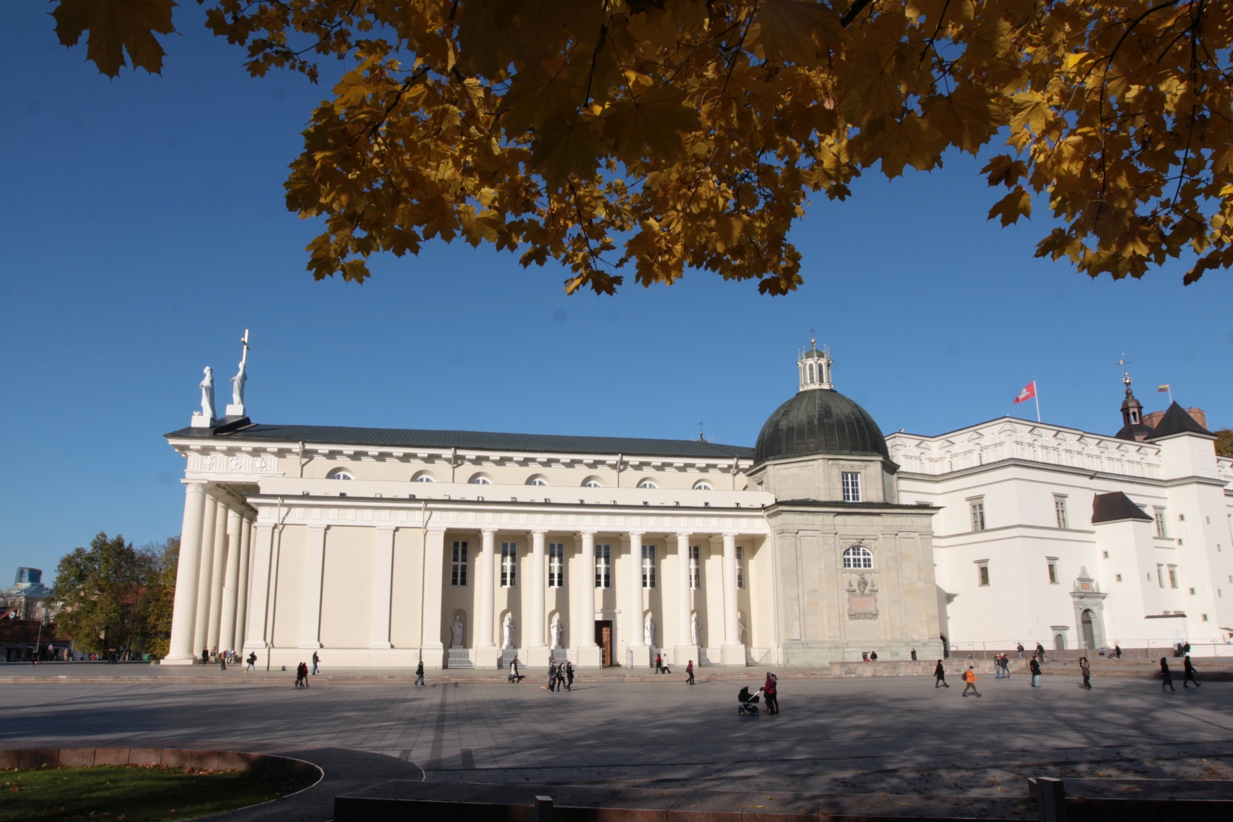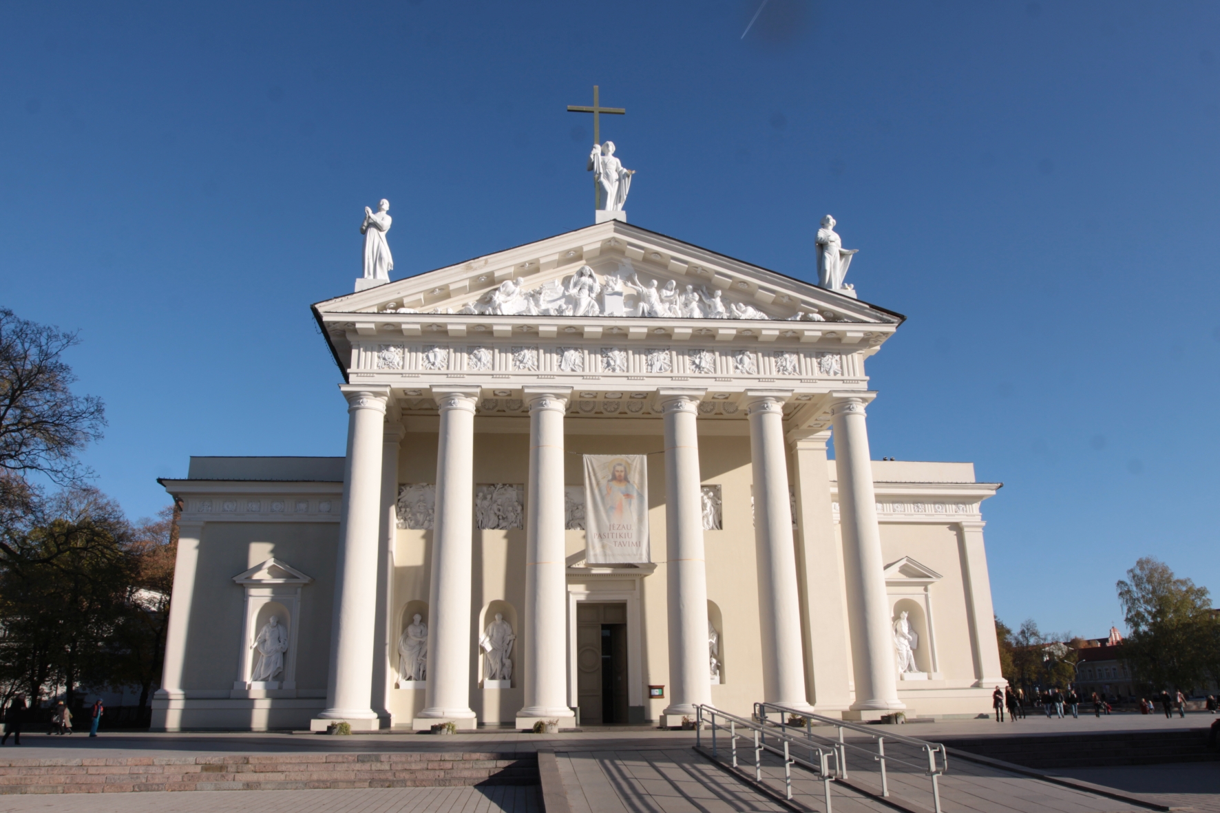 ![]() A. Petrašiūno nuotr., KPC Vilniaus katedra stovi žemutinės pilies teritorijoje, šalia Lietuvos didžiojo kunigaikščio rūmų1. Katedra pastatyta Pilies šlaito kyšulyje, pagoniškos šventyklos vietoje1. Istorijos bėgyje Vilniaus katedra patyrė įvairių kataklizmų, karų, gaisrų, potvynių ir daug kartų buvo perstatyta. Bažnyčios istorijaPirmoji Vilniaus katedra pastatyta nugriautos dievo Perkūno šventyklos vietoje2. Šios šventyklos mūro fragmentai aptikti tiriant Vilniaus katedros požemius 1984–1986 m3. Ši katedra, skirta Mindaugo krikšto ir karūnavimo progai, buvo vienintelė XIII a. Lietuvoje pastatyta bažnyčia 4. N. Kitkauskas nurodo, kad, užgesus krikščionybei, Mindaugo laikų katedra pertvarkyta į pagonišką šventyklą4. Statant katedrą skirtą Lietuvos krikštui 1387 m. pagoniška šventykla rekonstruota į gotikinio stiliaus katalikišką bažnyčią5. Kadangi Vilniaus katedrą lietuvių krikšto proga įsteigė ir pastatė Jogaila, todėl to meto katedra dažnai vadinama Jogailos katedra6. Ją 1388 m. Švč. Trejybės, Švč. Marijos, Šv. Stanislovo ir Šv. Vladislovo titulu konsekravo Gniezno arkivyskupas Bodzantas7. Jogailos pastatyta bažnyčia buvo nedidelė, kvadratinio plano su masyviais kontraforsais8. Prie katedros 1387 m. veikė mokykla, minima ir 1452 m7. 1399 m. kovo 17 d. Daugpilio komtūras pranešė Livonijos magistrui apie sudegusį Vilniaus miestą, katedrą ir didžiojo kunigaikščio iždinę9, 10. Atstatyta, vadinta Vytauto, katedra pašventinta 1407 m11. Po Vytauto Didžiojo mirties, tarp 1448 ir 1484 m., nedidelė kvadratinė bažnyčia buvo nugriauta ir pastatyta nauja didelė gotikinio stačiakampio stiliaus katedra ant kurios pamatų stovi ir dabartinė katedra5, 12. Katedra pastatyta ant medinių pamatų5. 1522 m. katedrą remontavo italų architektas Anus7. Šalia bažnyčios esančiame gynybos bokšte įrengta varpinė7. 1530 m. Vilniaus katedra sudegė10. Ją restauruoti patikėta Bernardui Zanobijui Džanočiui (Bernardino Zanobi de Gianotis), Džiovaniui Činiui (Giovani Cini) bei Bartolomėjui Fiesolei7, 10. Katedra perstatyta renesanso stiliumi ir baigta atnaujinti 1557 m5, 13. Ji buvo trinavė, turėjo šonines koplyčias14. Katedros fasadas buvo papuoštas frontonu ir portalu, o interjeras – freskomis, altoriais ir antkapiniais paminklais7. XVII a. katedra perstatyta baroko stiliumi5. 1610 m. gaisro metu sudegė katedros stogas ir medinės varpinės konstrukcijos15, 16. Remontui vadovavo architektas Vilhelmas Polis (Wilhelm Pohl)17. 1623–1636 m. Zigmanto Vazos iniciatyva architektas Konstantinas Tenkala (Costante Tencalla) pastatė Šv. Kazimiero koplyčią17. Po gaisro labai apgadintas Vytauto antkapis ir altorius sunyko ir daugiau nebuvo restauruoti15. 1639 m. katedrą nusiaubė naujas gaisras, bet bažnyčia buvo greitai atstatyta18. 1655 m., ATR ir Rusijos karo metu, katedra smarkiai apgadinta ir apiplėšta; vietomis įgriuvo pastato skliautai17. Rusijos kareiviai nuplėšė ir išsivežė varinį katedros stogą17. Rusijos kariuomenei artėjant prie Vilniaus, trijų valdovų bei Vytauto Didžiojo palaikai paslėpti: iš Karališkosios (Valavičių) koplyčios jie perkelti į Kapitulos kriptą po centrine nava ir atrasti tik 1931 m19. Šv. Kazimiero palaikai buvo išvežti į Ružanus ir Prūsiją20. Spėjama, kad Vytauto Didžiojo sarkofagas buvo atsitraukiančios Rusijos kariuomenės išvežtas į Rusiją kartu su kitomis meno ir architektūros vertybėmis21. 1666 m. austrų architektas Johanas Vincentas Salvadoras pradėjo katedrą remontuoti17. Dailininkas Džovanis Pjetras Pertis (Giovanni Pietro Perti) dekoravo Šv. Kazimiero koplyčią17. Italų dailininkas Mikelandželas Palonis (Michele Arcangelo Palloni) katedrai nutapė freskas17. 1730 m. katedra vėl remontuota, joje sudėtos marmuro plokščių grindys17. 1748–1754 m. katedrą restauravo architektas Jonas Kristupas Glaubicas14. Vakariniame fasade virš kampinių koplyčių buvo pastatyti du bokštai ir tarp jų įrengtas frontonas14. Bažnyčios stogas buvo dvišlaitis su lieknais bokšteliai ir aukštomis smailėmis galuose16. 1769 m. lapkričio 2 d. audra nugriovė katedros pietvakarių bokštą, kuris virsdamas perskėlė skliautus ir užmušė šešis Švč. Mergelės Marijos koplyčioje buvusius žmones17. 1771 m. architektui Martynui Knakfusui (Marcin Knakfus) sudarius defektinį planą, Vilniaus katedros kapitula pamaldas ir kitas katedros funkcijas perkėlė į Šv. Jonų bažnyčią14. Vilniaus vyskupo Ignoto Jokūbo Masalskio (Ignacy Jakub Massalski) pavedimu katedra pradėta rekonstruoti pagal Lauryno Gucevičiaus 1781 m. parengtą projektą17. Statybos ir rekonstrukcijos darbams Gucevičius pasikvietė italų architektą Pjetrą de Rosį (Pietro de Rossi)14. Katedros evangelistų skulptūras kūrė italų skulptorius Tomas Rigis (Thommaso Righi)17. Katedra perstatyta klasicizmo stiliumi5, 22. Rekonstrukcijos metu išlaikyti autentiški istoriniai rūmai, sienų mūras, vidaus aukštis ir halinė struktūra22. Tokia katedra išliko iki mūsų laikų22. Katedra turi gotikos (pagrindinės pastato dalies mūras), renesanso ir baroko (Šv. Kazimiero ir Valavičių koplyčios) stiliaus bruožų23. Katedros interjero erdvinė struktūra gotikinė, tačiau interjero puošyba klasicistinė23. Prie rytinės katedros sienos įrengtas didysis altorius atkartoja klasicistinio portalo architektūrą23. Katedroje yra vienuolika koplyčių šonuose, zakristija, du šoniniai įėjimai pietinėje ir šiaurinėje pusėje ir portikas vakarinėje dalyje22, 23. Abiejuose katedros šonuose architektas pastatė kolonadas, kurių frizai Šv. Kazimiero koplyčią ir zakristiją suvienija su naująja katedra23. 1836–1838 m. rekonstrukcijos metu, kuriems vadovavo Karolis Podčašinskis (Karol Podczaszyński), restauruotos senos bei įrengtos naujos koplyčios17. 1922 m. Vilniaus katedrai suteiktas bazilikos titulas17. 1925 m. katedra tapo arki